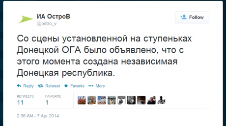 "Тільки пару годин тому ми повідомили про ввідну Кремля створити "Донецьку республіку", як у Донецьку зі сцени, встановленої на сходинках Донецької ОДА, оголошено про створення "незалежної Донецької республіки ", - написав він.