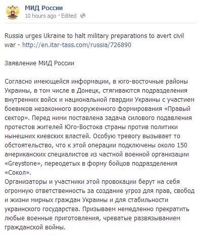 МЗС Росії заявило, що на схід України для "придушення протестів" спрямовані бойовики "Правого сектору" і 150 американців, переодягнених у форму підрозділу "Сокіл".