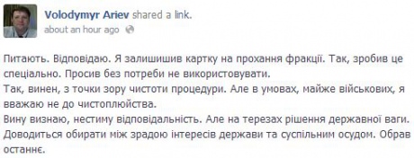 Ар’єв згодом зізнався у Facebook: "Я залишив картку на прохання фракції. Так, зробив це спеціально. Просив без потреби не використовувати".