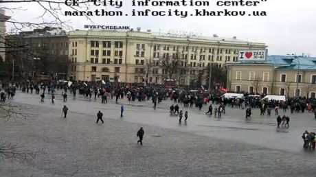 Пізніше очевидці у спільноті Євромайдан SOS повідомили, що у центрі міста "неспокійно: до площі Свободи підтягуються проросійські ополченці. Під'їжджають на машинах, мікроавтобусах. Надягають шоломи, маски та балаклави, дістають з багажників біти, труби і т.п. На вулицях Сумська та Римарська багато людей з російськими прапорами. Міліції багато, але вона до них досить лояльна".