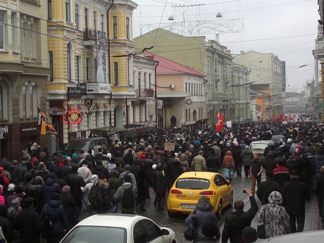 Перед цим тисячі людей пройшли від площі Свободи під міськрадою скандували "Іуда!" і "Сучий пес!", кидали дріб"язок на ганок ратуші. У натовпі дуже багато чоловіків в балаклавах і з палицями.