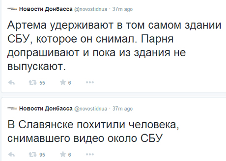 "У Слов'янську викрали людину, що знімала відео близько СБУ. Артема утримують у тій самій будівлі СБУ, яку він знімав. Хлопця допитують і поки з будівлі не випускають", - сказано у твіттері видання.