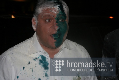 Згідно з повідомленням "Громадського телебачення", Добкіна облили зеленкою мітингувальники. Він втік від них без краватки.