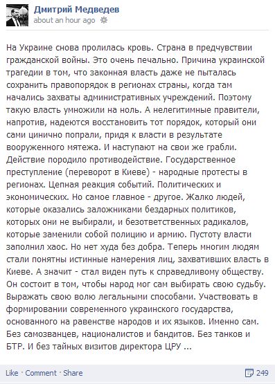 "Порожнечу влади заповнив хаос. Але немає лиха без добра. Тепер багатьом людям стали зрозумілі справжні наміри осіб, які захопили владу в Києві. А отже – стало видно шлях до справедливого суспільства", - написав російський прем'єр.