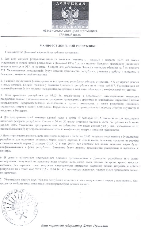 Сепаратисти вимагають від бізнесменів платити їм єдиний податок в 70 доларів США щомісяця, заявляють про введення продуктових карток і загальної мобілізації.