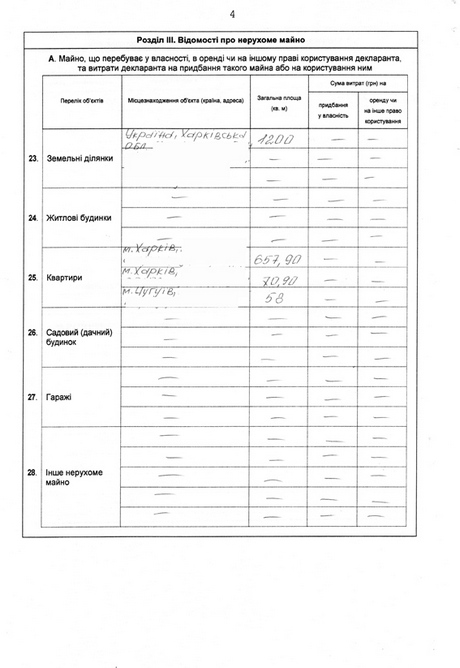 Аваков задекларував земельну ділянку в Харківській області площею 1200 м², дві квартири в Харкові (657,90 та 70,90 м²) та одну - в Чугуєві (площею 58 м²).