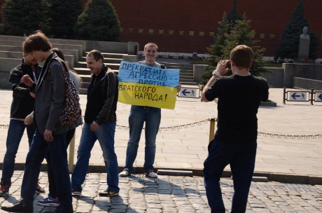 Як повідомляє ТСН, 19 квітня хлопець тримав у руках плакат у кольорах українського прапору, на якому було написано: "Припиніть агресію проти братського народу!".