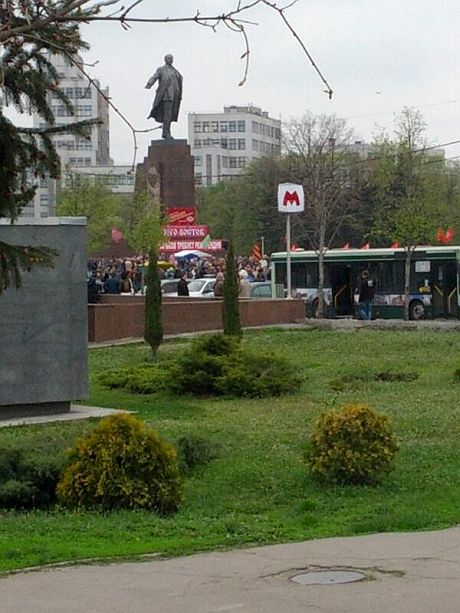 До постаменту Леніна прикріпили плакати з надписами "Юго-Восток", "Геть хунту", "Свободу політв'язням", "Харків вимагає референдуму".