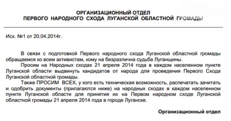 У планах організаторів винести на "референдум" в числі інших і такі питання: "Ви за Луганську область в якості федерального суб'єкта Росії?". Альтернативне питання : "... федерального суб'єкта України".