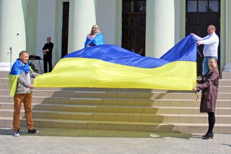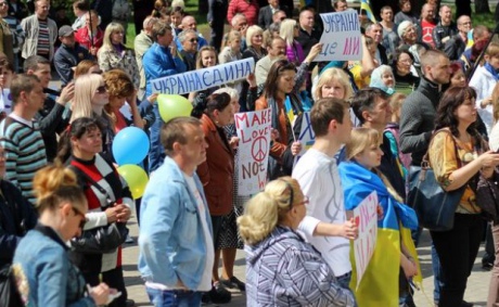 Учасники мітингу заявили, що "ніякої Росії нам не треба, ми будемо тут жити, в Україні". Також мітингувальники пов'язали на одяг у вигляді бантиків жовто- блакитні стрічки, розтягнули великий прапор України і випустили в небо жовті та блакитні повітряні кульки.