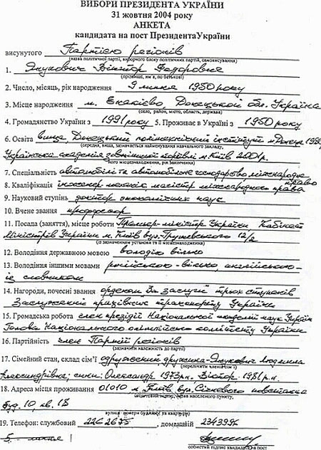 Для порівняння почерку на документі з "Межигір’я" він навів анкету Віктора Януковича, заповнену ним як кандидатом на виборах президента у 2004 році.
