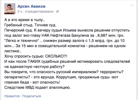 "Суддя Ільйова винесла рішення відпустити під заставу екс-голову НАК "Нафтогазу" Бакуліна за.. 9,987 млн. грн.. "Легко та технічно"…знижений розмір застави 1,5 мільярди гривень на 10 мільйонів.. За 15 хвилин в дорадчій кімнаті – рішенням на одній сторінці", - написав він на своїй Facebook-сторінці.