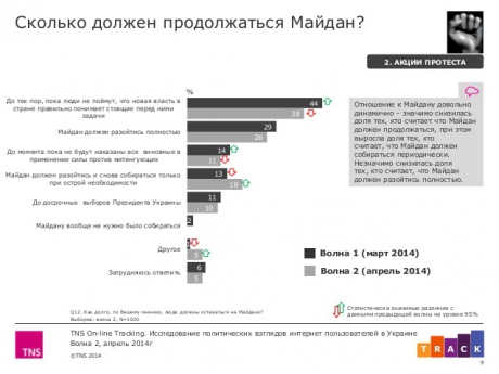 При цьому до середини квітня зменшилася з 44% до 38% кількість тих, хто вважає, що Майдан у Києві повинен стояти доти, доки люди не зрозуміють, що нова влада правильно розуміє завдання, які перед нею стоять. 10% вважали, що він повинен стояти до виборів президента.