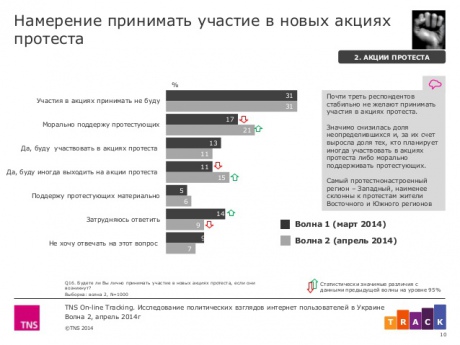 Майже третина громадян не бажають брати участь у акціях протесту, близько чверті станом на квітень готові протестувати (11% точно й 15% іноді), підтримувати протестувальників більше готові морально (21%), ніж матеріально (6%).