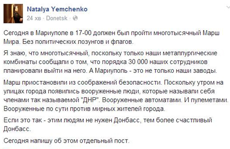 "Оскільки вранці на вулицях міста з'явилися озброєні люди, які називали себе членами так званої "ДНР". Озброєні автоматами. І кулеметами. Озброєні по суті проти мирних жителів міста. Якщо це так - цим людям не потрібний Донбас, тим більше щасливий Донбас", - написала Ємченко.
