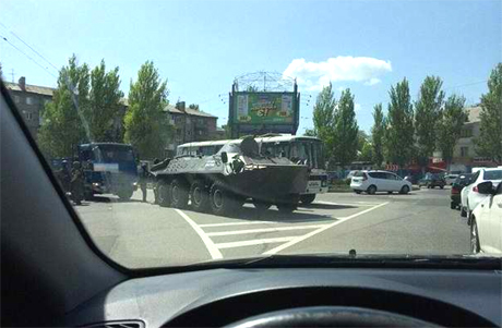 Крім того, на вулиці площі Бакинських комісарів були помічені БТРи. На БТРі й автобусі написано "Батальйон "Схід". Такий батальйон був створений сепаратистами. Крім того, так називався спецпідрозділ Міноборони Росії, сформований з колишніх чеченських бойовиків.