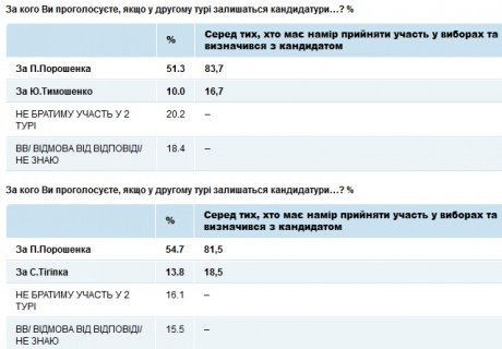 Серед тих, хто має намір прийти на виборчі дільниці та визначився зі своїм вибором, перша п’ятірка президентських перегонів виглядала би наступним чином: Порошенко – 53,2%, друге місце посідає Тимошенко, яка отримала б 10,1% голосів, на третій сходинці знаходиться Тігіпко – 8,8%., Ляшко та Гриценко, в такому випадку, отримали б 6,3% та 6,2% відповідно.