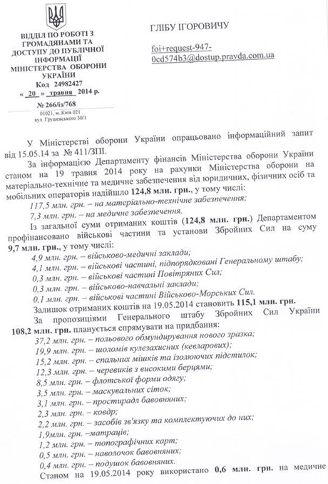 У відомстві зазначають що із загальної суми отриманих коштів 124,8 мільйона гривень (сума станом на 19 травня) 9,7 мільйона пішли на фінансування військових частин, 0,6 мільйона гривень - на медичне забезпечення.
