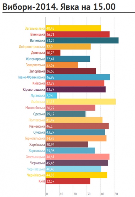 Найвища явка зареєстрована у Рівненській області - 50,51%, найнижча - у Донецькій області - 10,78%.