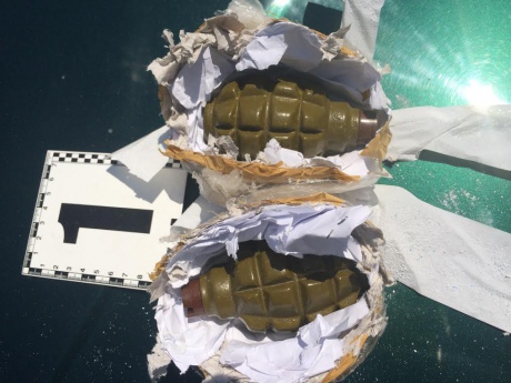 Під час огляду пакунку правоохоронці виявили та вилучили 3 гранати Ф-1 з запалами, вогнепальну зброю з набоями до нього, 1000 доларів США та інструкцію, де вказано кому і яким чином вона має бути передана.