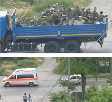 "По Панфілова убік Артема підіймається колона бронетехніки й живої сили. У складі колони три вантажівки, три автобуси з кавказцями й зброєю. Також у колоні є легкові автомобілі й мікроавтобуси, усього 15 машин", - повідомляє читач.