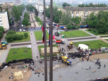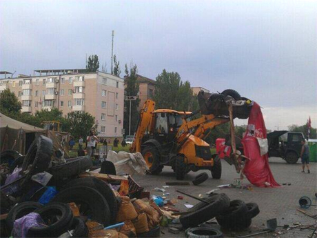 Станом на 16:26, трактор почав зносити барикади. Бойовики з "Востоку" кажуть, що в підвалі були розтяжки", - написав у твіттері журналіст Євген Фельдман.