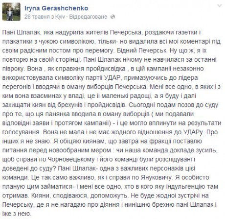 Раніше депутат "Удару" Ірина Геращенко заявляла, що Шлапак "надурила жителів Печерська, роздаючи газетки і плакатики з чужою символікою".