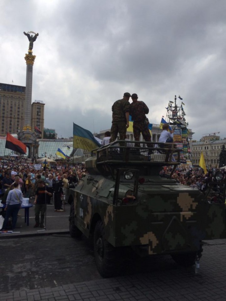 "Приїхали з хлопцями на Майдан. Будемо тут дві години. Забрали 23 людини на фронт. Хто хоче з нами - підходьте до людей у чорній формі з написом "Батальйон Донбас" або у формі запорізької самооборони. Збір біля "донецького намету" або позаду сцени біля 28 сотні", - повідомив Семенченко.