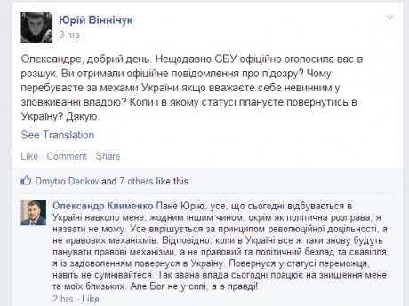 Як відомо, Служба безпеки України 31 травня оголосила в розшук колишнього міністра доходів і зборів Олександра Клименка.