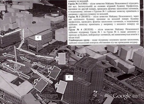 У пункті 5 Оперативного задуму описано розташування снайперів: "Розміщення снайперських пар на дахах та в приміщеннях будинків (вул. Хрещатик, 7/11, 13, 19а, 22)". "У разі потреби буде задіяний гелікоптер МІ-8. Виконавець - ВВ МВС, ЦСО "А" СБУ", - додається у документі.