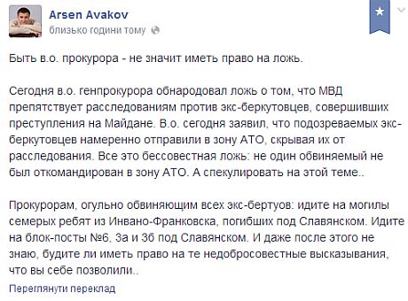 "Бути в. о. генпрокурора – не означає мати право на брехню. Сьогодні в. о. генпрокурора оприлюднив брехню про те, що МВС перешкоджає розслідуванням щодо екс-беркутівців, які здійснили злочини на Майдані", - написав Аваков на своїй сторінці у Facebook.