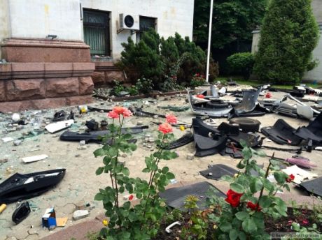 Від будівлі посольства відвезли перевернуті і покручені машини російських дипломатів.