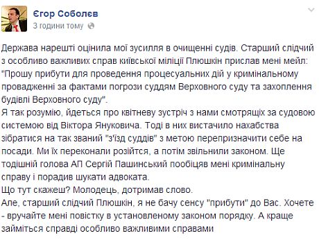 "Держава нарешті оцінила мої зусилля в очищенні судів. Старший слідчий з особливо важливих справ київської міліції Плюшкін прислав мені мейл: "Прошу прибути для проведення процесуальних дій у кримінальному провадженні за фактами погрози суддям Верховного суду та захоплення будівлі Верховного суду", - повідомив Соболєв.