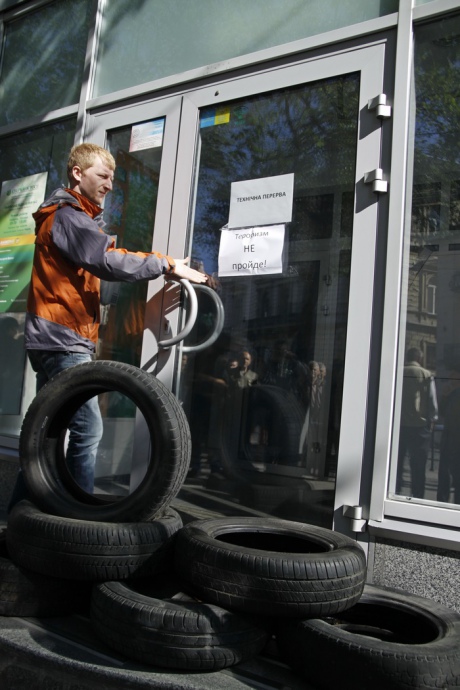 Учасники пікету поклали під входом у відділення кілька шин, зверху поклали коробки сірників, а поруч - яйця і помідори.