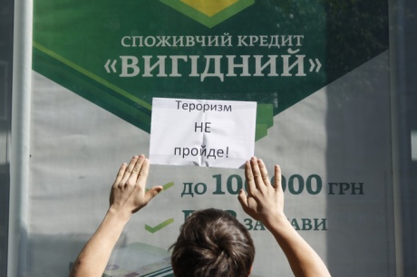 На вхідні двері вони прикріпили листок з написом "Тероризм не пройде", а біля шин - плакат "Цей банк фінансує тероризм".