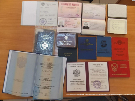 Крім того, як повідомили прикордонники, серед речей чоловіка був диплом Ленінградського державного університету імені А.С. Пушкіна (викладач фізичної культури), посвідчення працівника вугільної промисловості, блокнот з записами, посвідчення міського професійного центру підготовки приватних охоронців РФ та багнет-ніж (кортик).