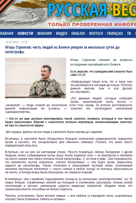 "По-третє, ні на чому не наполягаю (поки). Просто буквально зараз розмовляв із двома людьми, що особисто збирали трупи одразу після падіння (обоє — із Шахтарська й прибули на місце менш ніж за півгодини після катастрофи). За їхніми словами і пишу. Вони підкреслили, що безліч трупів виявилися "зовсім безкровні" — начебто кров згорнулася задовго до катастрофи", - повідомив Гіркін.