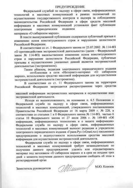 "Просто вражаюча історія з цим "Маршем за федералізацію Сибіру", який проводять в Новосибірську. Навіть не зрозуміло, куди посилання дати, щоб пояснити, що таке цей марш, тим, хто не в курсі (а це майже все). Через локальні заходи місцевих активістів Роскомнадзор влаштував цілу істерику і виніс попередження 14 (!!!) ЗМІ про неприпустимість розміщення інформації про марш. Будь-яке посилання на нього виглядає так",-зазначив Навальний.