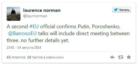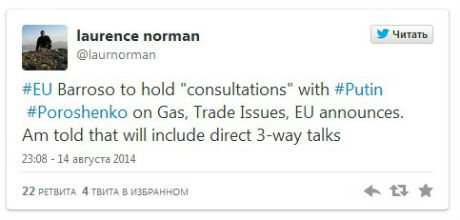 "Баррозу збирається провести консультації з Путіним та Порошенко щодо газових та торгівельних питань... Мені повідомили, що це включатиме безпосередні тристоронні переговори (лідерів України, Росії та Євросоюзу)", - написав Норман в ніч на п'ятницю, після анонсу консультацій з боку ЄС.