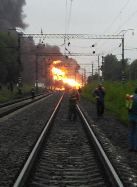 В п’ятницю о 06:35 на залізничній станції "Городище", 20 залізничних цистерн з нафтопродуктами і локомотив зійшли з рейок, 11 з них загорілися.