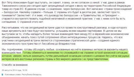 Решту промови він присвятив міркуванням про економіку та критикуці наміру України ратифікувати угоду про асоціацію з ЄС.