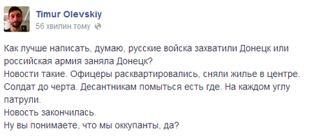 "Як краще написати, думаю, російські війська захопили Донецьк чи російська армія зайняла Донецьк?" - написав він.