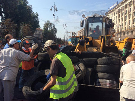 На Майдані комунальники прибирають барикади, шини на конструкції на перетині вул.Хрещатик та Городецького.