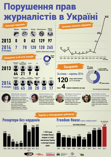 За 8 місяців 2014 році в зв'язку з війною та подіями на Майдані збільшилася кількість випадків порушення прав журналістів.