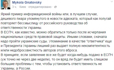 "Іншими словами, спочатку треба пройти українські суди. ... В принципі, якщо заяву все ж буде коли-небудь подано в ЄСПЛ (вже точно не через два тижні), то суд навряд чи буде мати занадто великі проблеми з тим, щоб встановити відповідальність не України, а Росії", - додав Гнатовський.