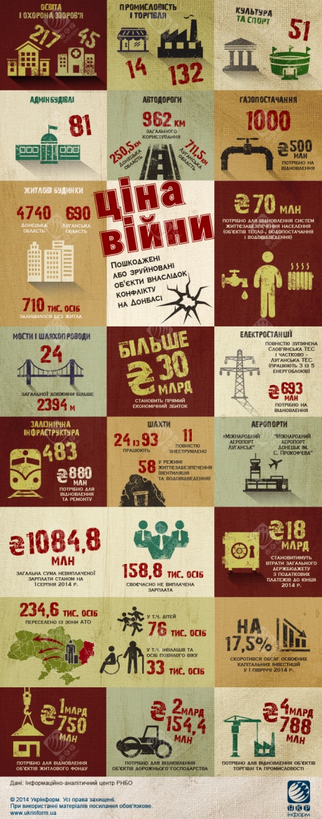 За попередніми підрахунками, тільки прямий економічний збиток країни внаслідок загострення суспільно-політичної ситуації і збройного протистояння на сході держави можна оцінити в суму більше 30 млрд гривень.