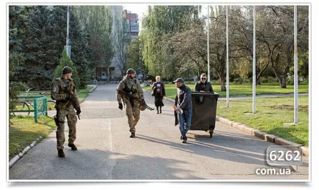 Біля виконкому стоять молоді люди в спортивних костюмах і балаклавах, які не пускають в будівлю окремих людей.