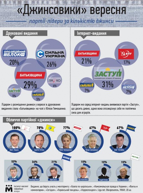 У вересні лідером з розміщення джинси у всеукраїнських друкованих виданнях стала партія "Батьківщина", а в інтернет-видання - партія "Заступ".