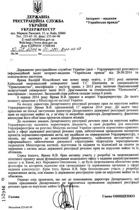 "З червня 2014 року Ярема В. В. працює в апараті Укрдержреєстру. До цього моменту працював у Міністерстві юстиції. На посаду директора Департаменту реєстрації майнових прав на нерухоме майно Ярема В. В. призначений 17 вересня 2014 року", - йдеться у документі.