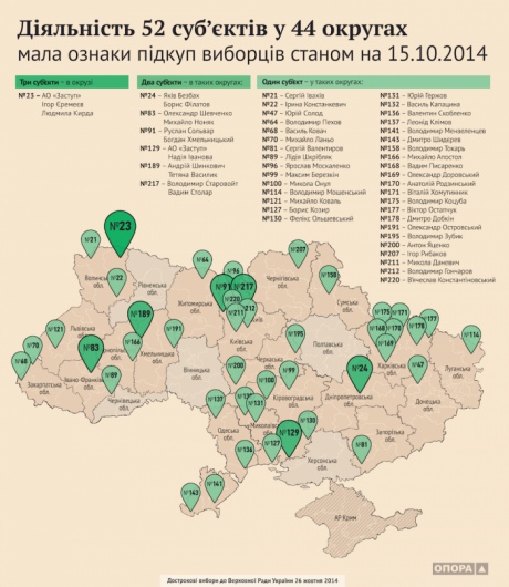 Підкуп виборців зафіксовали у кампаніях 52 учасників виборів (кандидати і партії) у 44 з 213 одномандатних округів.